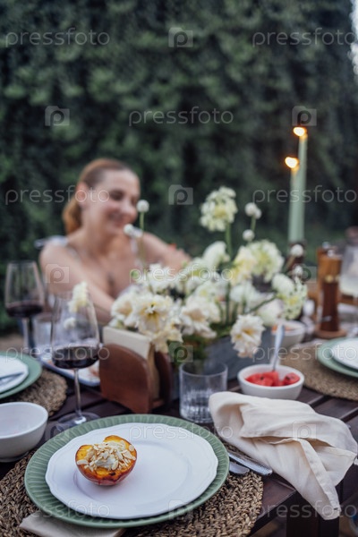 Крупный план тарелки запеченного персика с кремом и миндалем. Накрытый праздничный стол, украшенный цветами и свечами