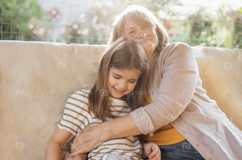 Улыбающаяся зрелая женщина и ее милая внучка на заднем дворе дома