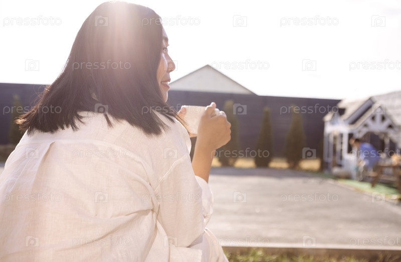 Азиатская мама держит чашку и пьет чай на заднем дворе дома