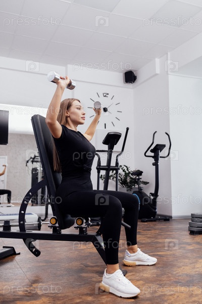 Спортивная молодая блондинка в черной спортивной одежде выполняет жим гантелей на наклонной универсальной скамье в тренажерном зале или фитнес-студии