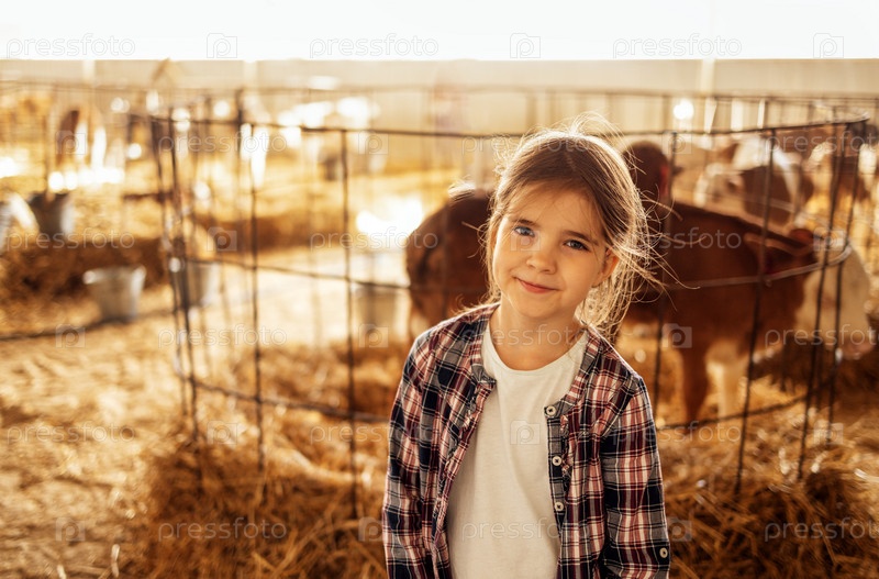Портрет маленькой девочки в клетчатой рубашке на ферме крупным планом. Милый ребенок улыбается в коровнике