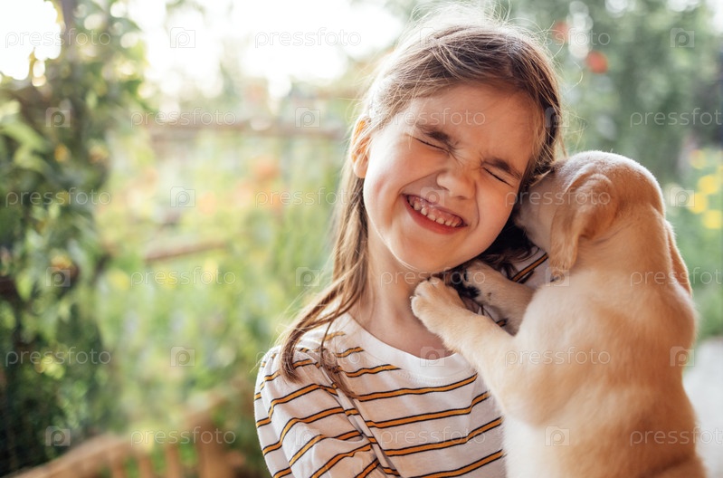 Портрет маленькой девочки, обнимающей щенка. Милый маленький ребенок играет с собакой