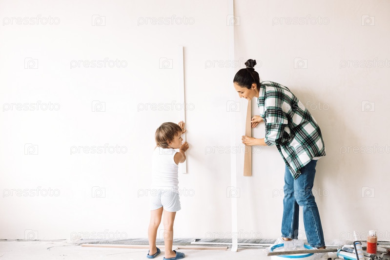 Маленький мальчик и его улыбающаяся мама выбирают украшения для будущего интерьера комнаты. Молодая женщина играет с сыном во время ремонта