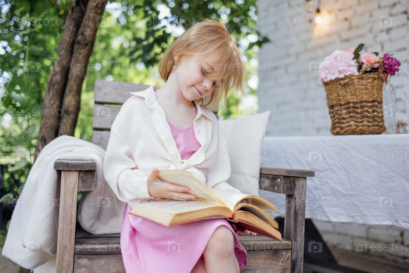 Милая маленькая девочка сидит на деревянном стуле и смотрит в книгу. Милый ребенок в розовом платье и белой рубашке листает книгу в саду или на заднем дворе дома