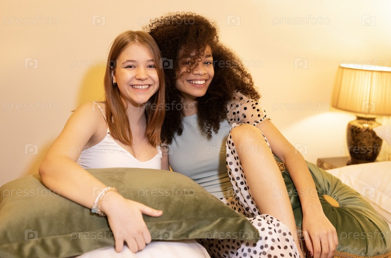 Симпатичные подростки разных рас в повседневной одежде развлекаются на кровати в спальне