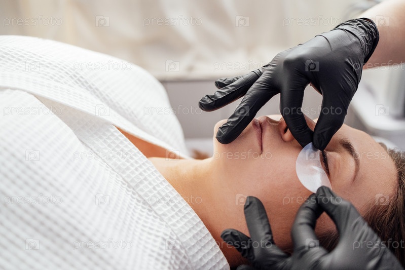 Процедуры в салоне красоты. Крупный план мастера, накладывающего силиконовые патчи под глаза симпатичной клиентки-блондинки. Кавказская молодая женщина получает профессиональный уход за кожей лица