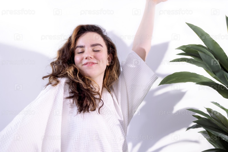 Портрет крупным планом молодой привлекательной кудрявой женщины в халате, улыбающейся в спа-салоне