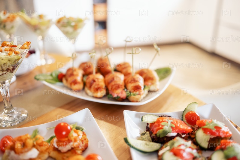 Крупный план вкусных закусок на деревянном столе в столовой дома