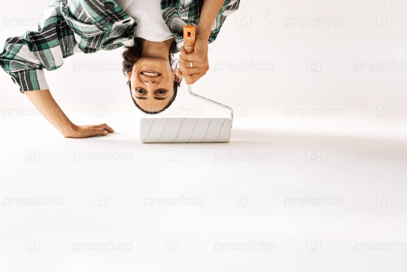 Молодая женщина в повседневной одежде красит стену дома. Вид снизу. Очаровательная девушка держит валик. Счастливая брюнетка делает ремонт квартиры