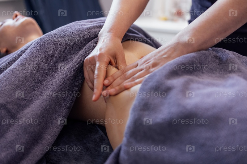 Крупным планом молодые женские руки делают массаж живота в салоне красоты или клинике