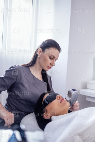 Портрет спокойной молодой клиентки, проходящей процедуру ультразвуковой коррекции лица SMAS