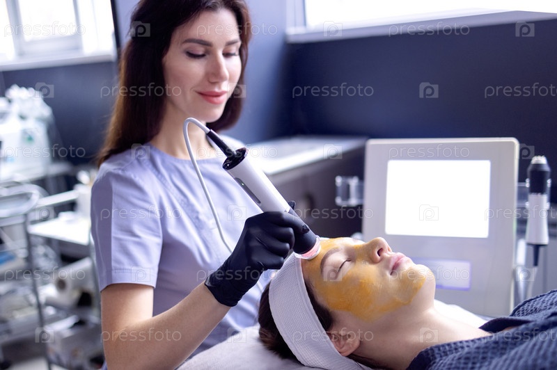 Женщина на химической оксигенации кожи за счет активации биогеля. Косметолог проводит процедуру насыщения кислородом и омоложения кожи в спа. Нежный пилинг