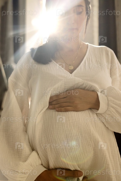 Крупный план молодой беременной женщины, нежно держащей свой живот. Красивый естественный солнечный свет. Привлекательная брюнетка, ожидающая ребенка, касается своего живота
