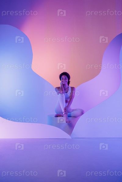 Молодой африканец сидит, скрестив ноги, на круглой платформе. Черная спортивная девушка в белом фитнес-костюме улыбается