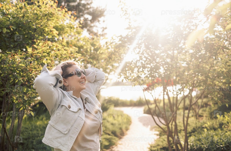 Молодая женщина в солнечных очках и повседневной одежде смеется в парке. Привлекательная девушка наслаждается природой и солнечным днем