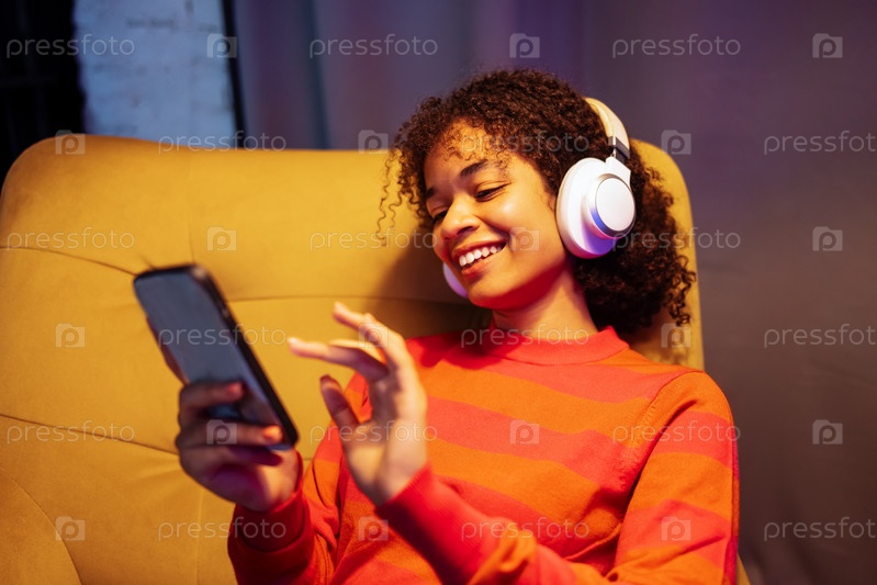 Улыбающаяся африканская женщина сидит в кресле и разговаривает по телефону