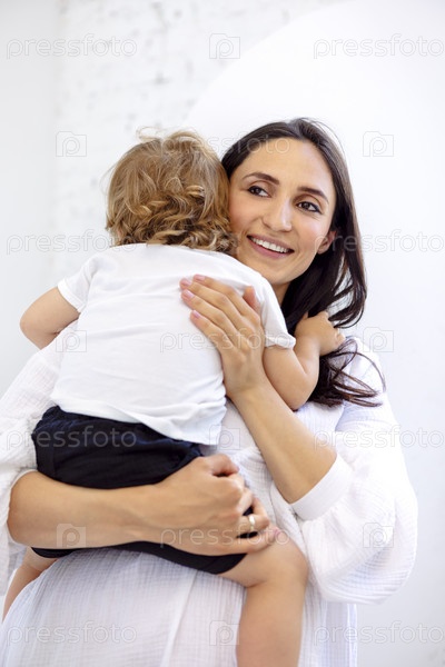Крупный план милого ребенка с очаровательной мамой в повседневной одежде