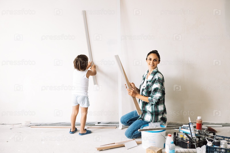 Маленький мальчик и его улыбающаяся мама выбирают украшения для будущего интерьера комнаты. Молодая женщина играет с сыном во время ремонта