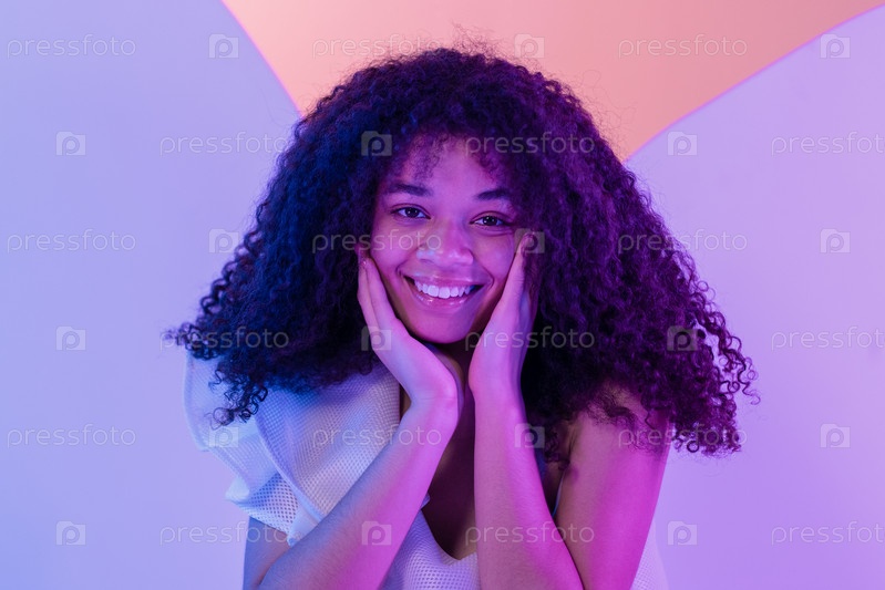 Портрет крупным планом улыбающейся привлекательной африканской женщины в белом платье. Милая черная кудрявая девушка позирует в студии. Яркий неоновый красочный фон