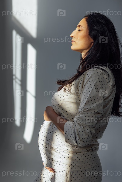 Беременная женщина стоит в профиль возле окна в платье в горошек
