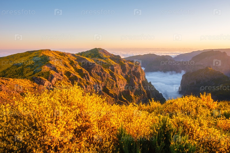 Вид с Пику-ду-Ариейру на горы над облаками с цветущими кустами цитисуса на закате с солнечными лучами, остров Мадейра, Португалия
