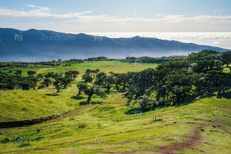 Вид с воздуха на идиллический живописный лес Фанал-Лаурисильва с вековыми деревьями тил. Остров Мадейра, Португалия