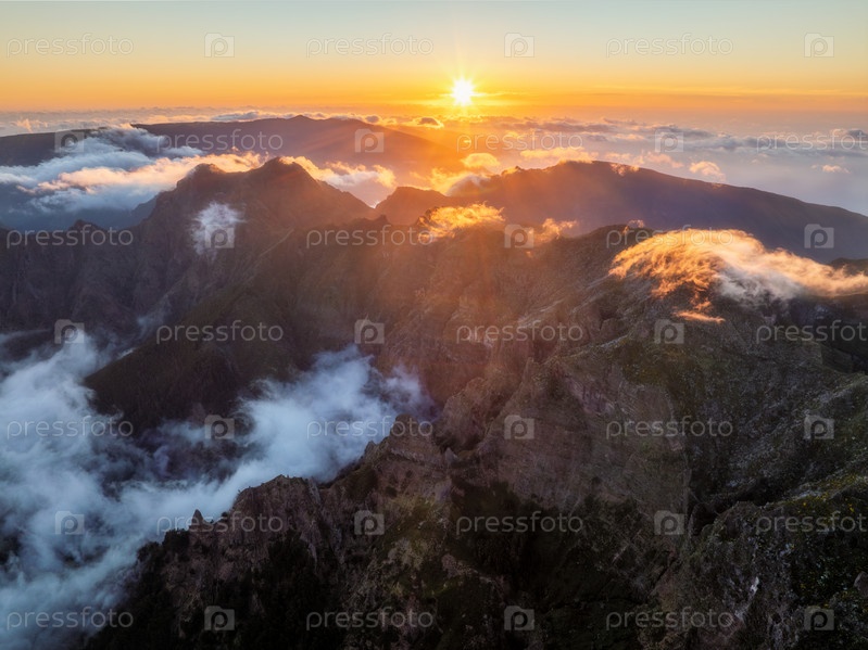 Вид с воздуха с дрона на горы над облаками около Пику-Руйву на закате. Остров Мадейра, Португалия