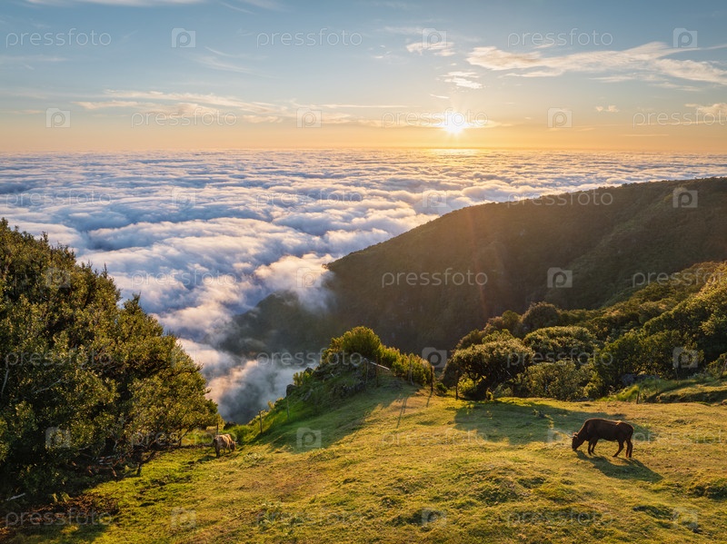 Вид с воздуха на восход солнца над облаками и зелеными холмами с коровами, пасущимися на горе Фанал, остров Мадейра, Португалия
