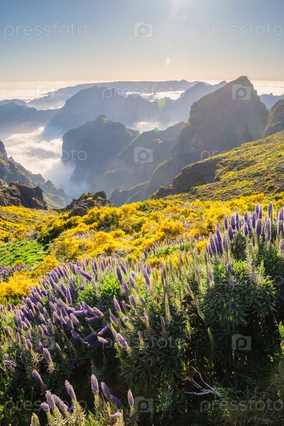 Вид с Пику-ду-Арейру на горы над облаками с цветами Pride of Madeira и цветущими кустарниками Cytisus в закате со солнечными лучами