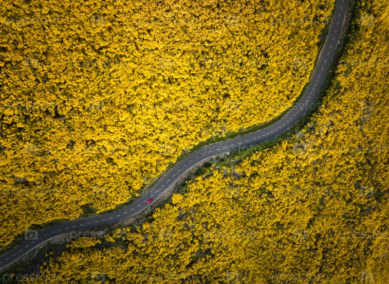 Вид с воздуха на дорогу среди цветущих кустарников Cytisus недалеко от Пику-ду-Арейру, Португалия