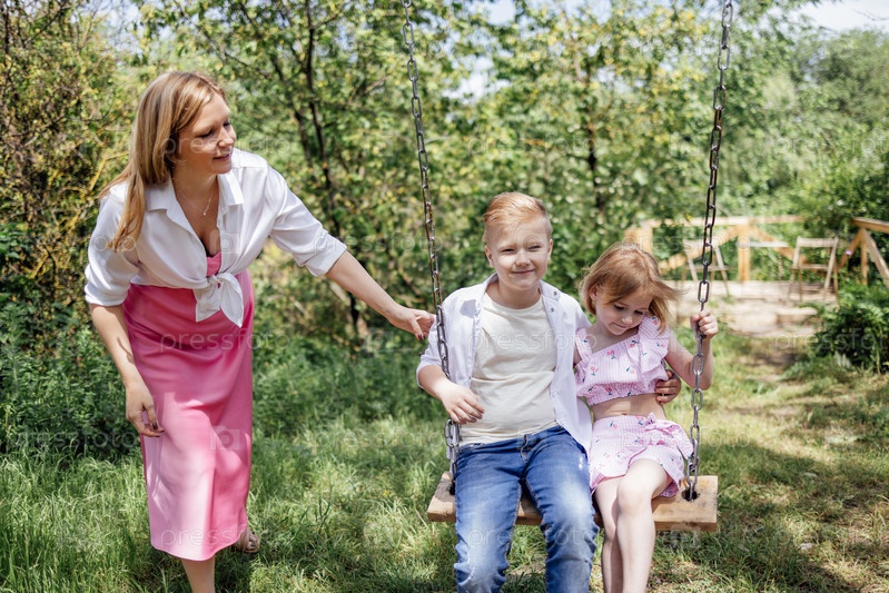 Молодая привлекательная мама катает своих милых детей на качелях на лугу в парке