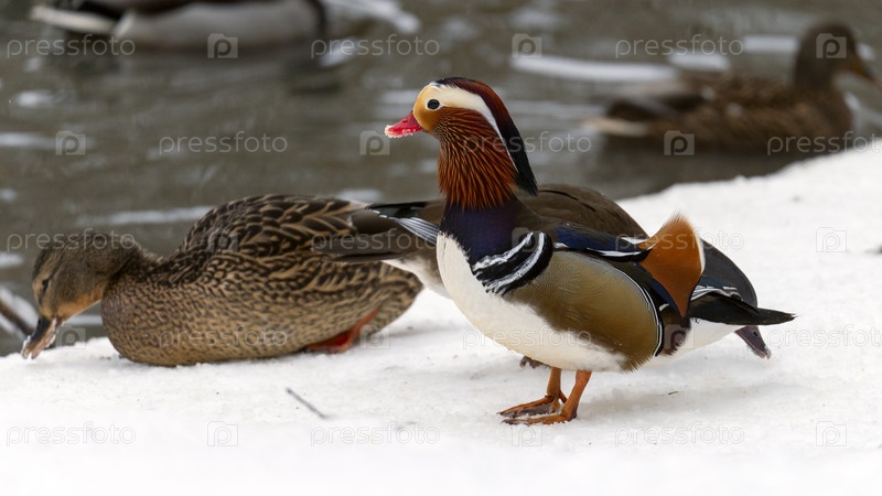 Утка-мандаринка зимой, Утки в снегу крупным планом
