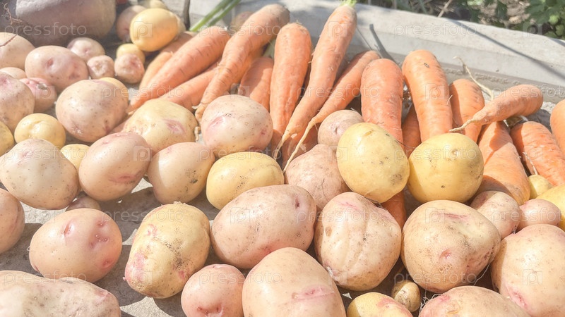 Куча картофеля и моркови на столе