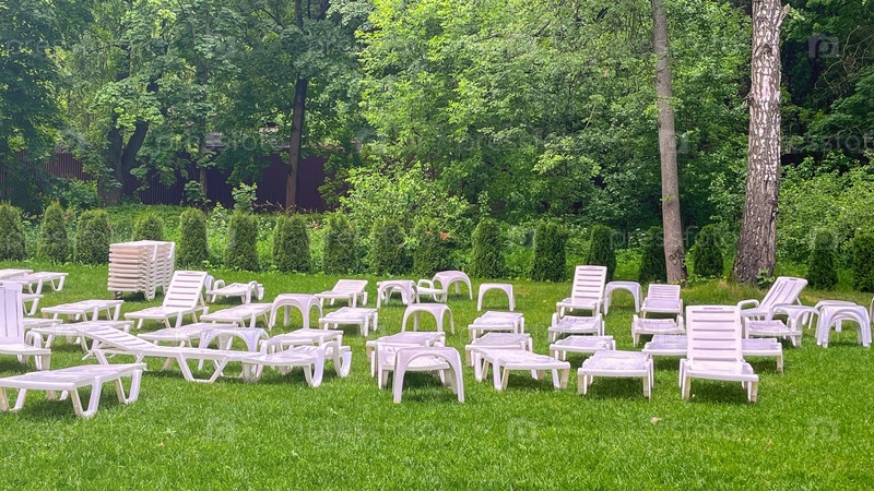 Большое травянистое поле с множеством белых шезлонгов, разбросанных по всему полю