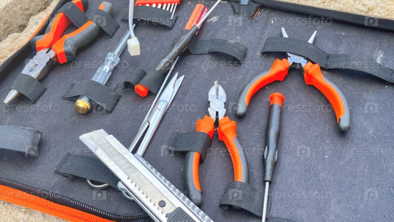 Набор инструментов с различными инструментами, включая плоскогубцы