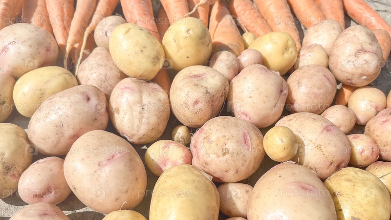 Свежие молодые овощи крупным планом. Концепция экологически чистого продукта. Куча овощей, включая морковь, картофель и свеклу. Морковь самая заметная