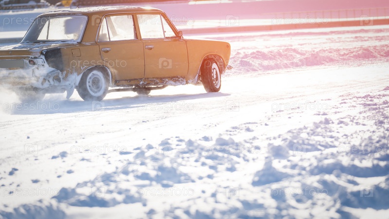 Автомобиль на заснеженной дороге в заносе, скользкая дорога, небезопасное вождение на зимней заснеженной дороге, селективный фокус, тонированное изображение, блики на солнце