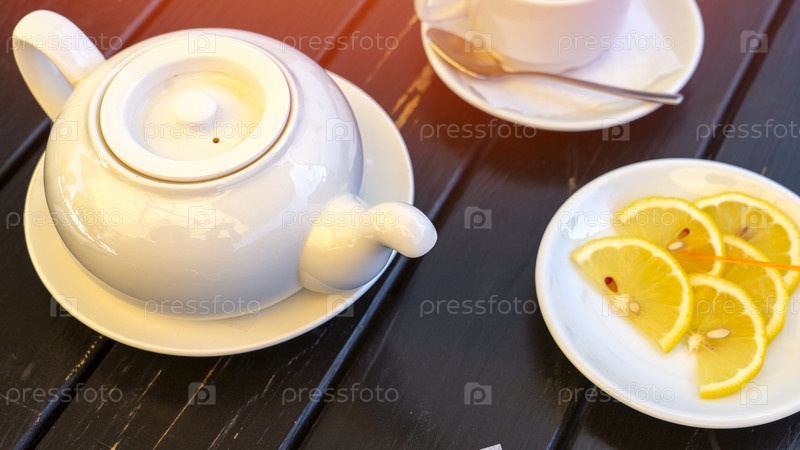 Белый чайник стоит на деревянном столе с тарелкой нарезанных лимонов