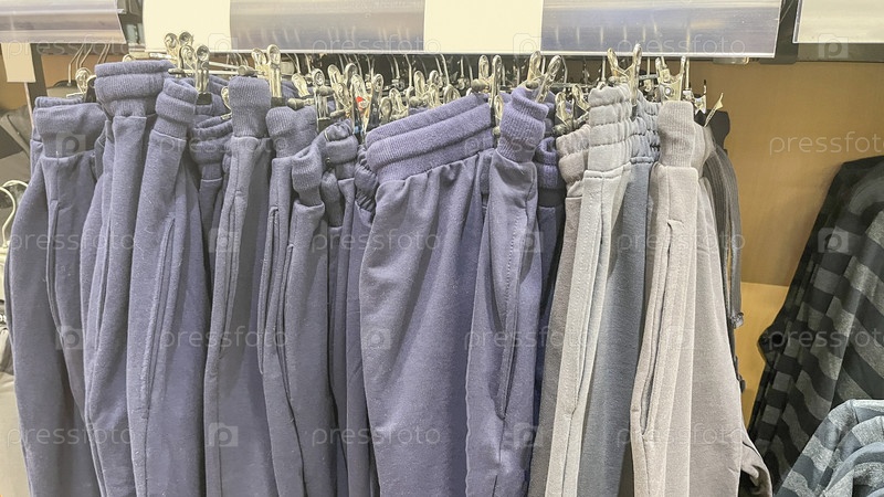 Стойка с синими и серыми спортивными штанами