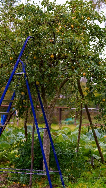 Спелые желтые груши осенью на дереве, хороший урожай груш. Груши поспели. Сбор урожая с грушевого дерева