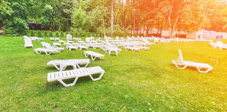 Большое травянистое поле с множеством белых шезлонгов, разбросанных по всему полю
