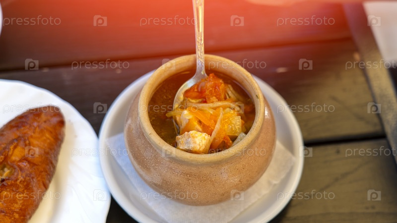 На столе стоит тарелка супа с ложкой в ней