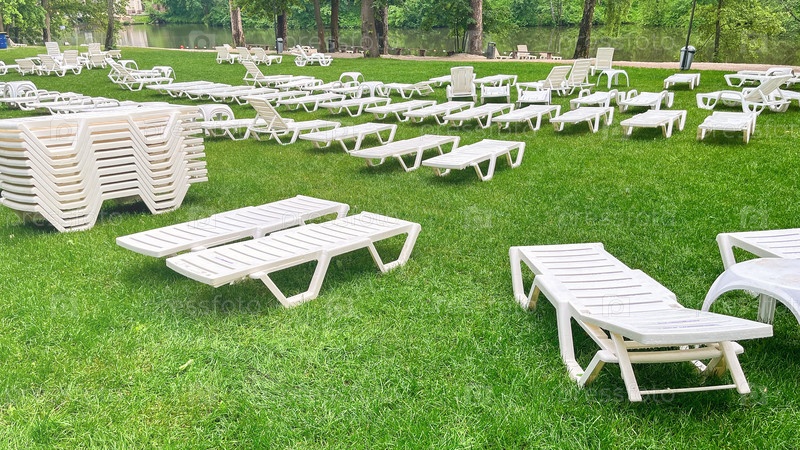 Большое травянистое поле с множеством белых шезлонгов, разбросанных по всему полю