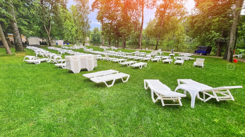 Большое травянистое поле с множеством белых шезлонгов, разбросанных по всему полю