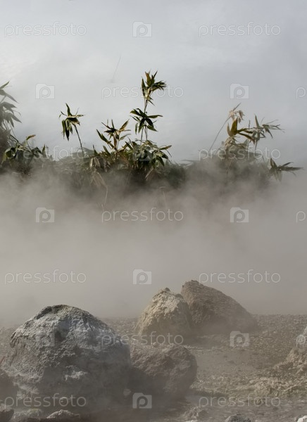 Россия. Курильские острова. Живописный плавучий термальный источник (Кипящая река) недалеко от вулкана Барановский на острове Итуруп, температура воды в источнике которого достигает 80 градусов