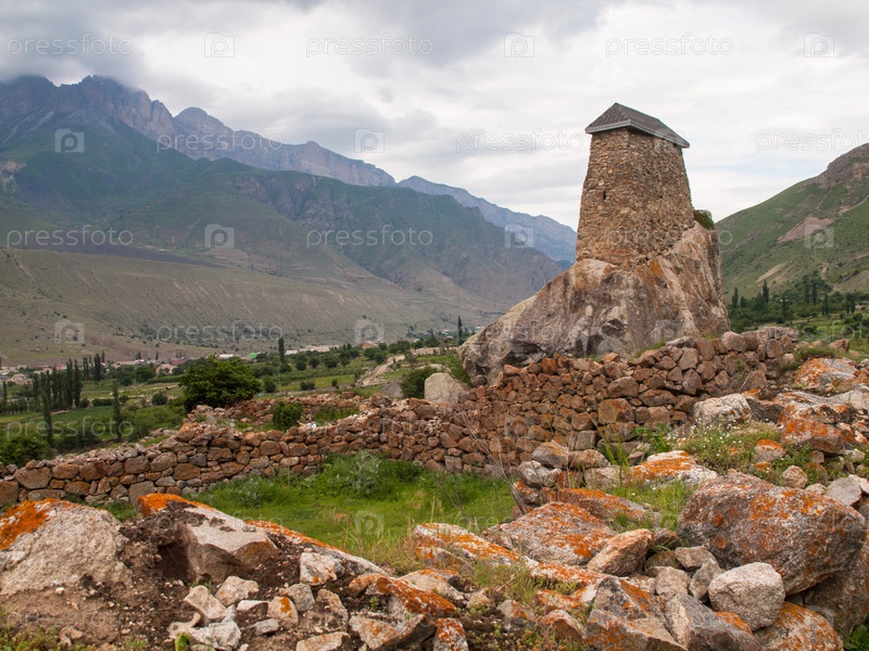 Старинная каменная башня Амирхановых (Амирхан-Кала) возвышается среди руин на фоне гор в окрестностях села Верхняя Балкария в Черекском ущелье, Кабардино-Балкария, Россия