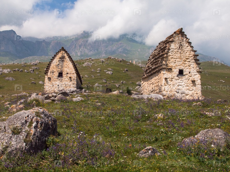 Вид снизу на два старинных каменных склепа на фоне гор, село Цимити, Куртатинское (Фиагдонское) ущелье, Республика Северная Осетия - Алания, Россия