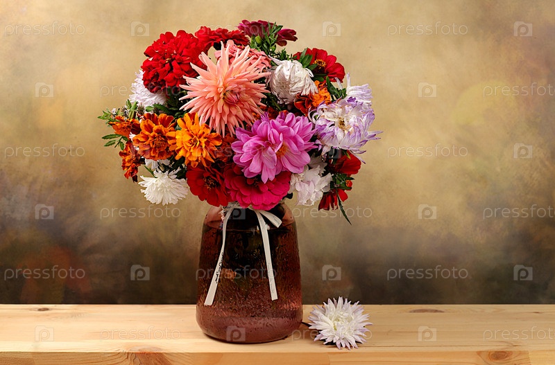 Абстрактная цветочная композиция, Красивый натюрморт с букетом георгинов, астр, бархатцев на старом мраморном столе, осенний баннер, деревенский стиль, праздничная открытка, селективный фокус
