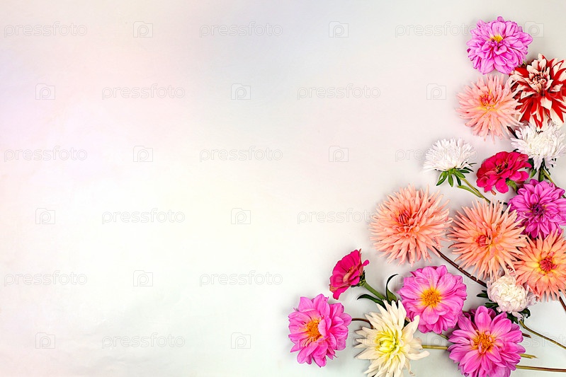 Абстрактная цветочная композиция, плоская планировка. Цветы георгины, астры, лютики на светлом фоне, осенний баннер для рекламы, праздничная открытка с местом для текста, селективный фокус