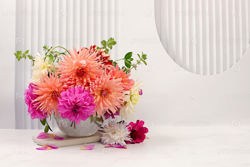 Красивые цветы георгины, астры, лютики в вазе, осенний баннер для рекламы, абстрактная цветочная композиция, праздничная открытка, сезонный натюрморт, выборочный фокус